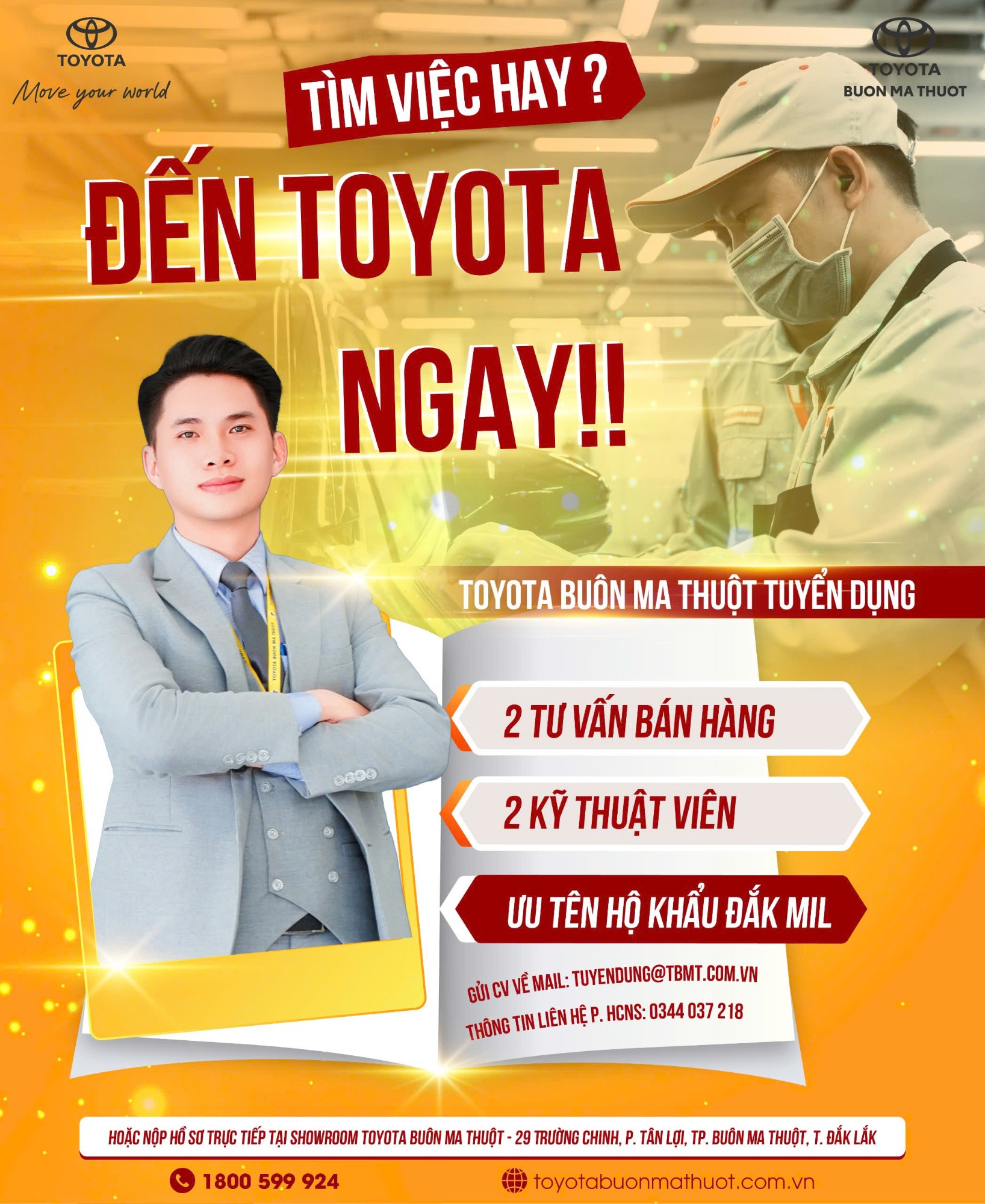 Toyota Buôn Ma Thuột hiện đang tìm kiếm các ứng viên tiềm năng cho chi nhánh tại Đắk Mil – với cơ hội làm việc trong môi trường chuyên nghiệp, ổn định và phát triển lâu dài.