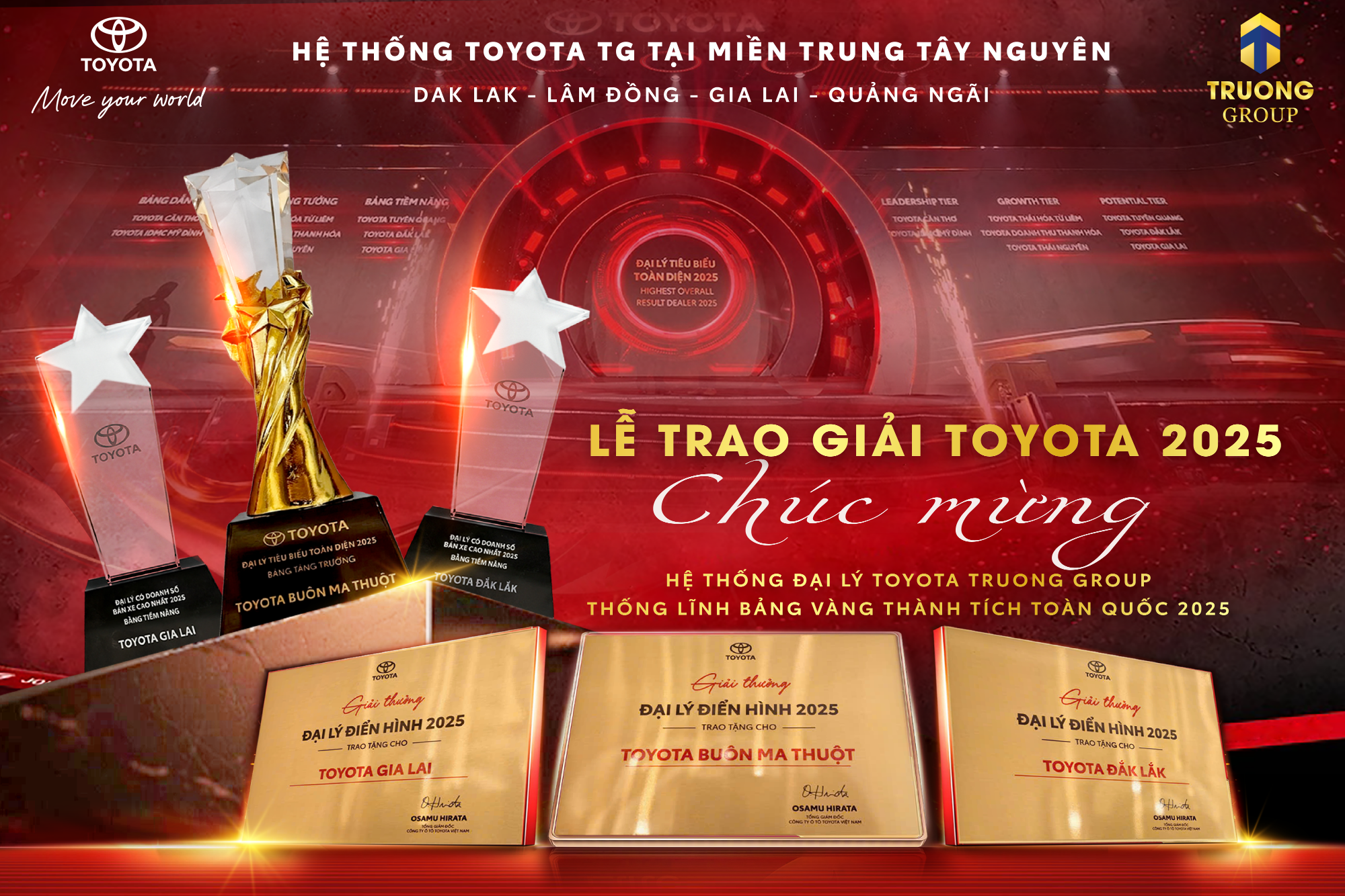 Ngày 12/03/2026 tại Hà Nội, Toyota Việt Nam đã tổ chức lễ tổng kết hoạt động năm 2025 và vinh danh các đại lý xuất sắc trên toàn quốc. Tại sự kiện, Hệ thống đại lý Toyota Truong Group đã tạo dấu ấn nổi bật với hàng loạt giải thưởng danh giá, khẳng định vị thế dẫn đầu tại khu vực miền Trung – Tây Nguyên, đặc biệt tại Toyota Buôn Ma Thuột và Toyota Dak Lak.