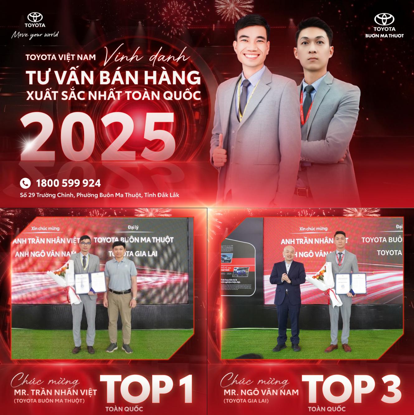Trong bảng xếp hạng tư vấn bán hàng toàn quốc, anh Trần Nhân Việt – Toyota Buôn Ma Thuột xuất sắc được vinh danh Top 1 và anh Ngô Văn Nam – Toyota Gia Lai đạt Top 3 "Tư Vấn Bán Hàng Xuất Sắc Nhất Toàn Quốc 2025". Đây là những đại diện tiêu biểu cho đội ngũ tư vấn giàu kinh nghiệm, luôn đồng hành cùng khách hàng trong hành trình lựa chọn xe Toyota phù hợp.