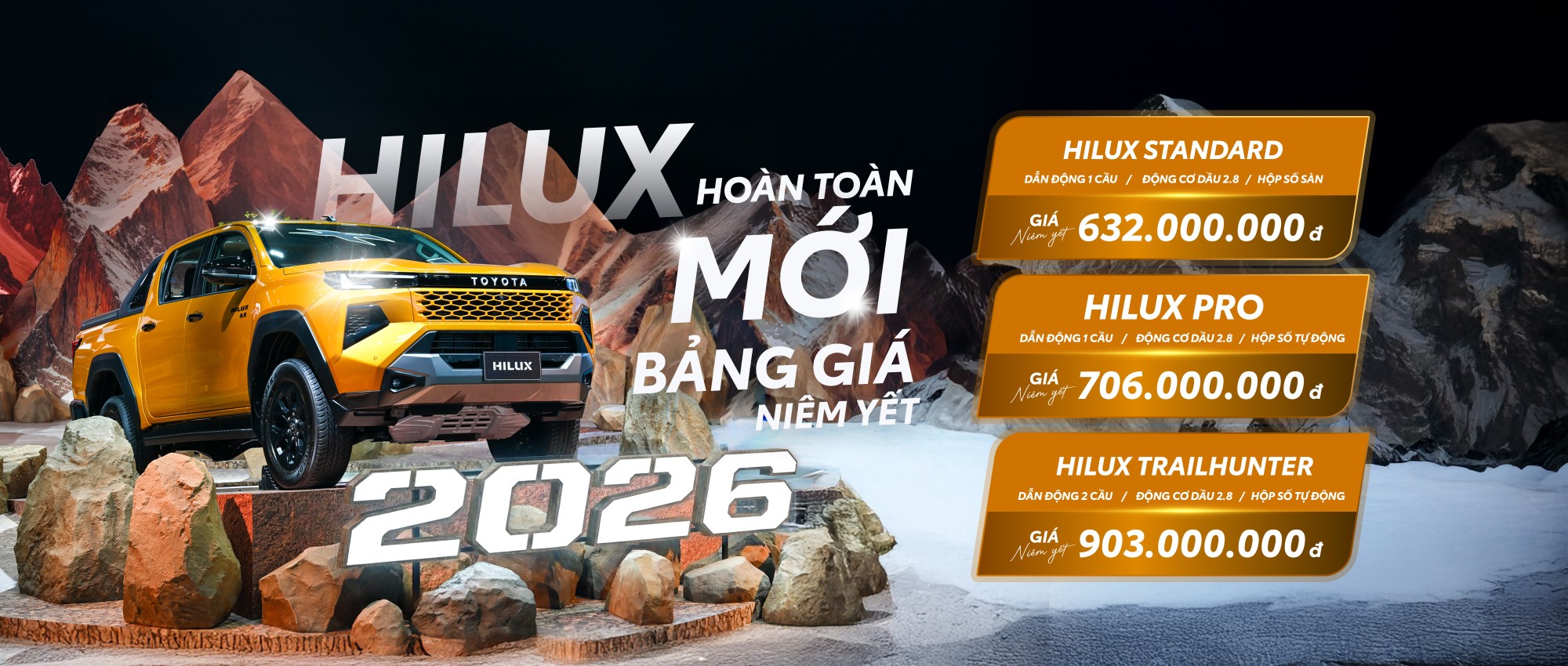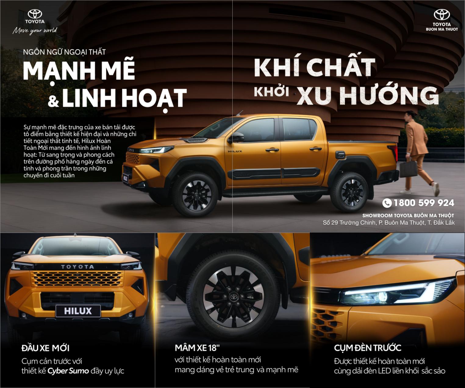 Công ty ô tô Toyota Việt Nam (TMV) và Toyota Buôn Ma Thuột tự hào giới thiệu Hilux hoàn toàn mới 2026 - một trong những mẫu xe bán tải bán chạy nhất trên thế giới. Hilux hoàn toàn mới 2026 đã chính thức có mặt tại tất cả các hệ thống đại lý của TMV trên toàn quốc kể từ ngày hôm nay 29/01/2026.