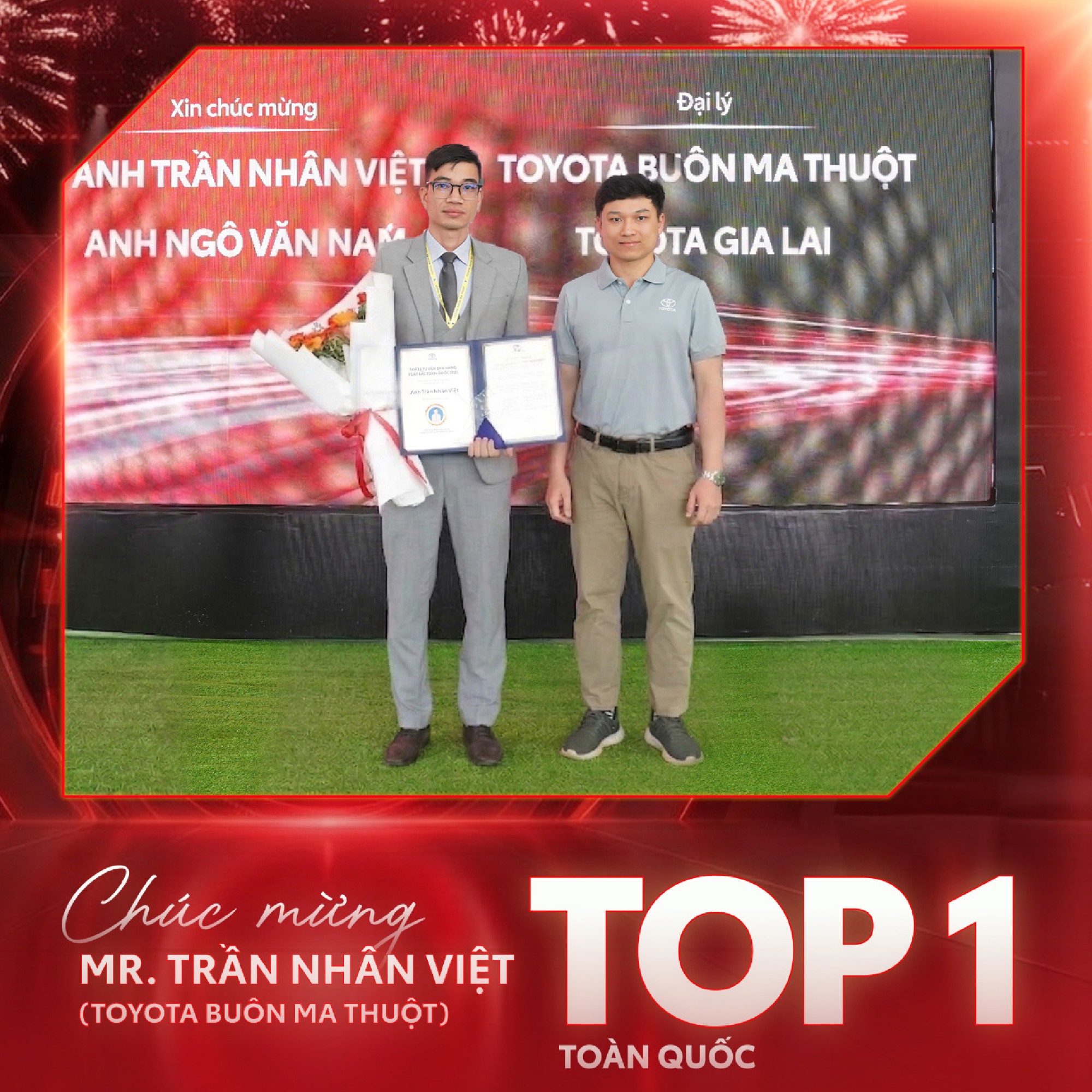 Trong bảng xếp hạng toàn quốc, anh Trần Nhân Việt – tư vấn bán hàng của Toyota Buôn Ma Thuột đã xuất sắc đạt Top 1 "Tư Vấn Bán Hàng Xuất Sắc Nhất Toàn Quốc", khẳng định năng lực tư vấn chuyên sâu và khả năng đồng hành cùng khách hàng trong quá trình lựa chọn xe Toyota phù hợp.