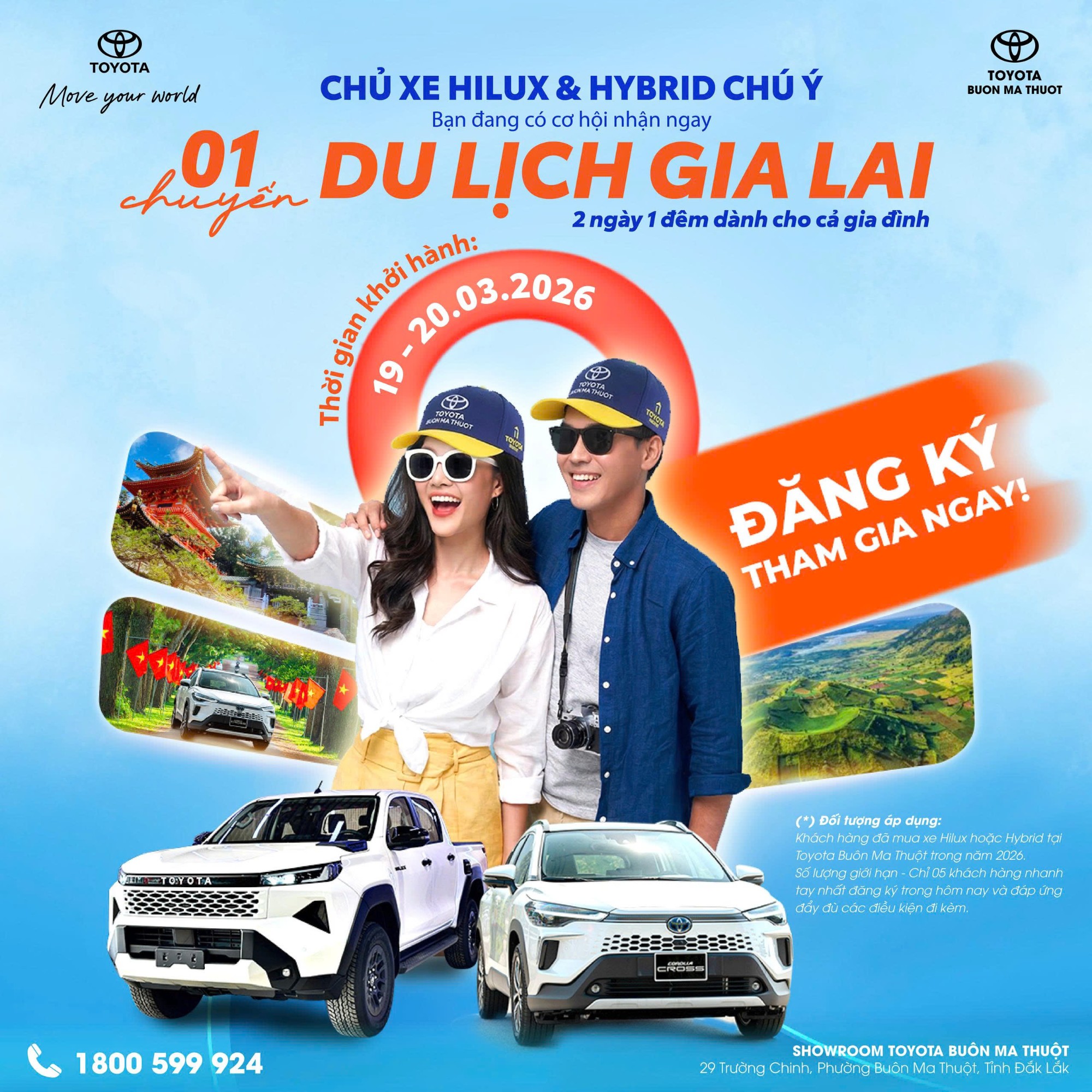 Bên cạnh hoạt động trải nghiệm, Toyota Truong Group triển khai chương trình tri ân đặc biệt dành cho khách hàng tại Đắk Lắk. Theo đó, khách hàng mua xe Toyota Hilux hoặc các dòng xe Hybrid 2026 tại Toyota Buôn Ma Thuột và Toyota Dak Lak sẽ có cơ hội nhận chuyến du lịch Gia Lai 2 ngày 1 đêm dành cho gia đình.
